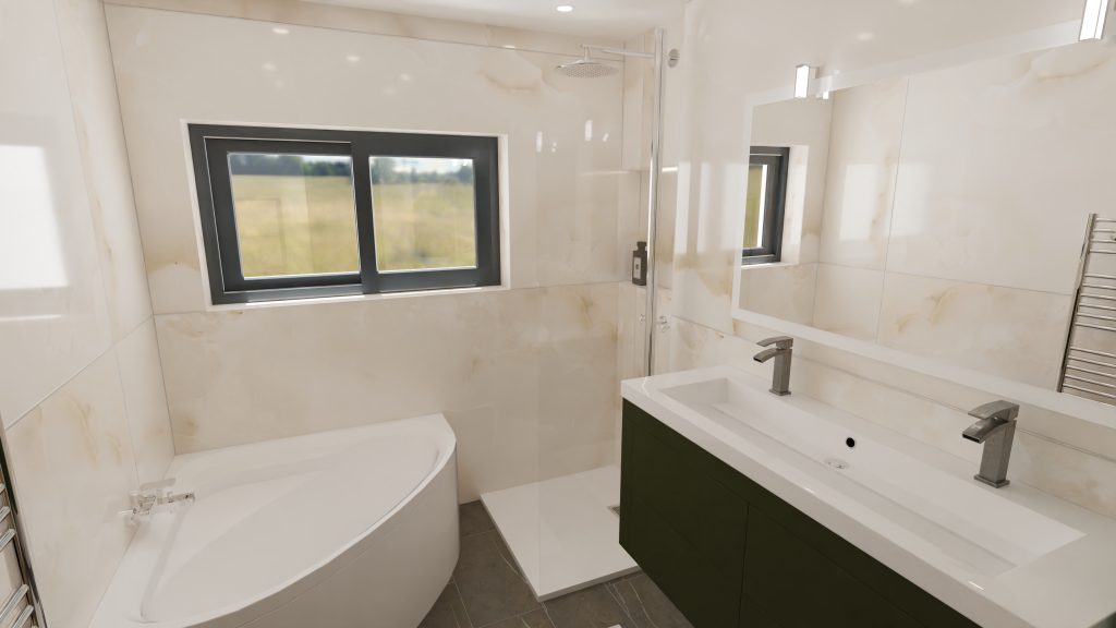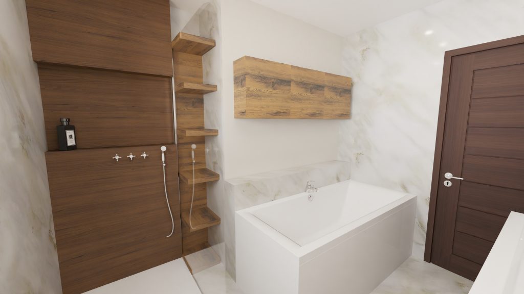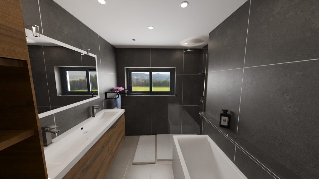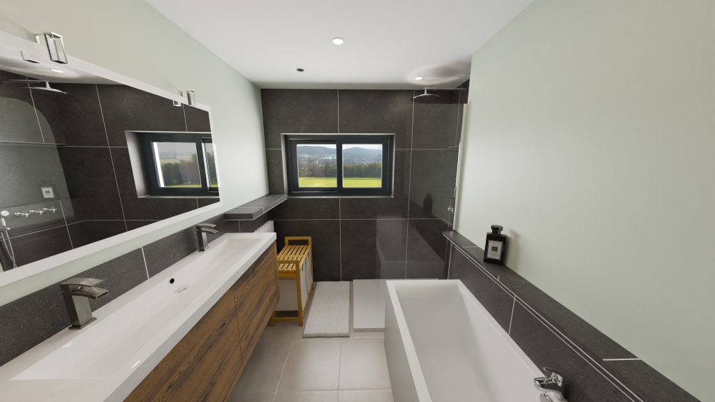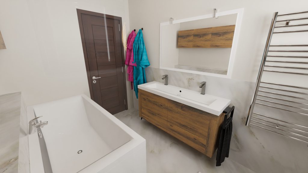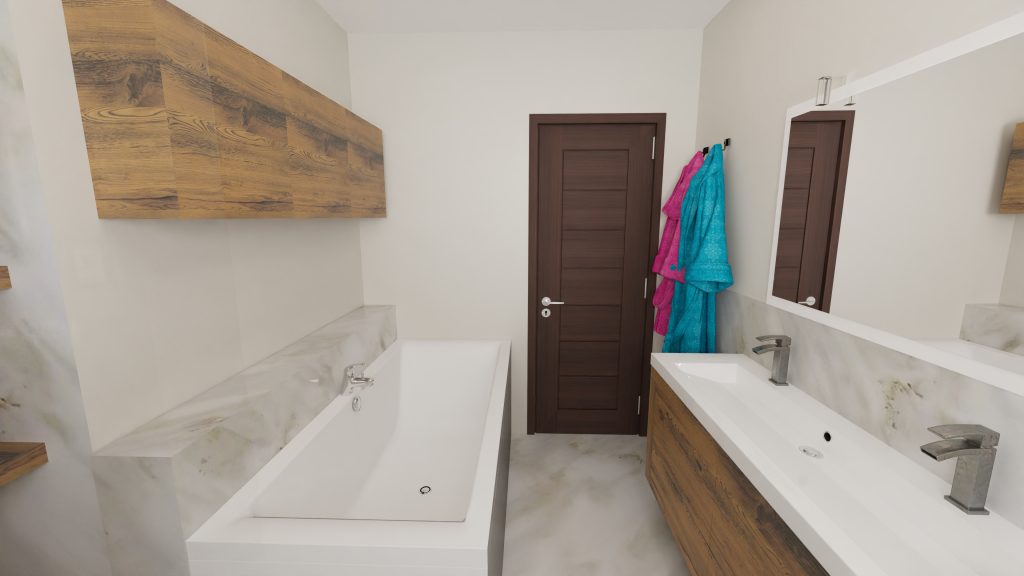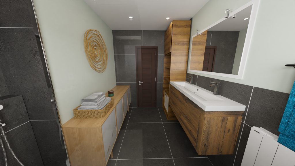 Le souhait du client est d’avoir une baignoire, une douche, une double vasque et du rangement.