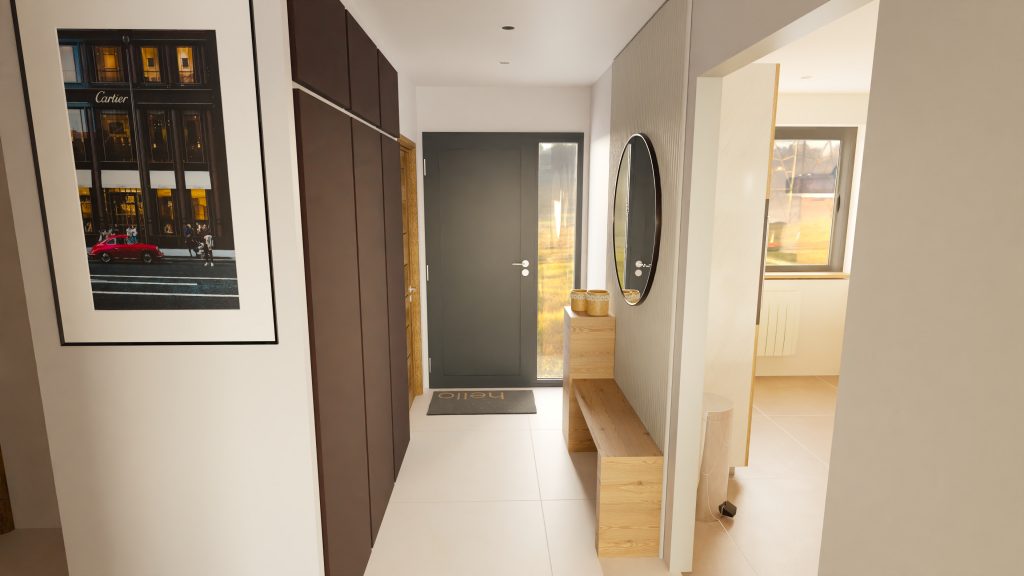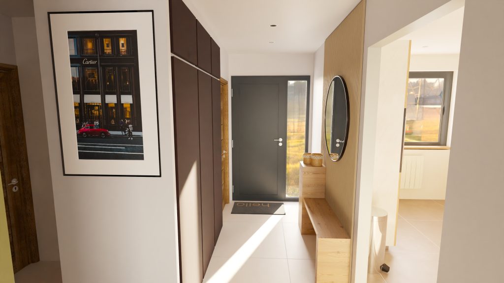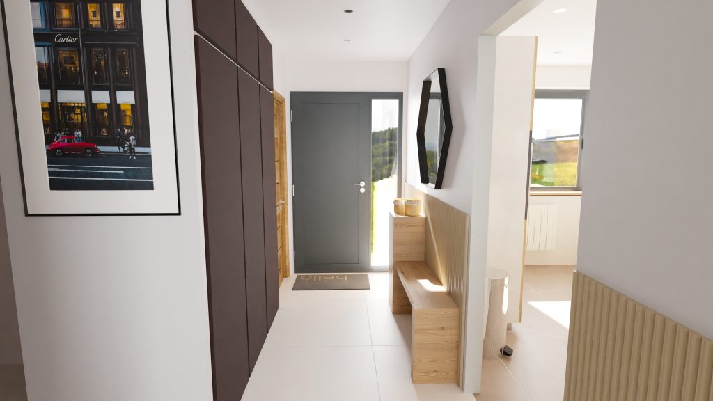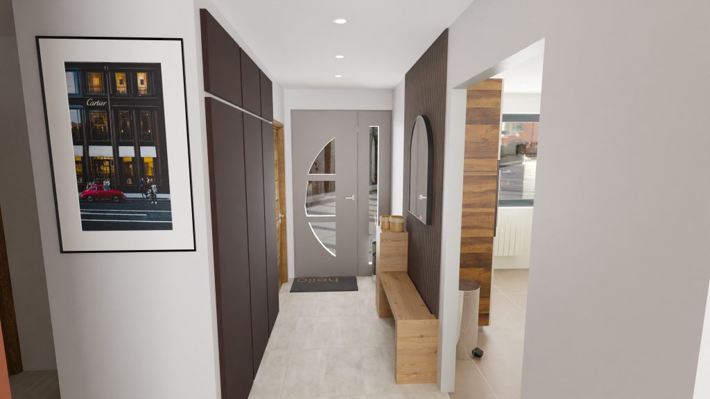 - Conserver le placard d’entrée et rénover les portes en bois de couleur foncé