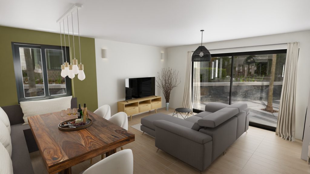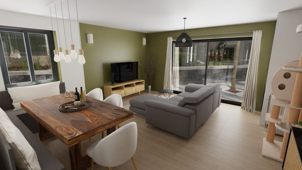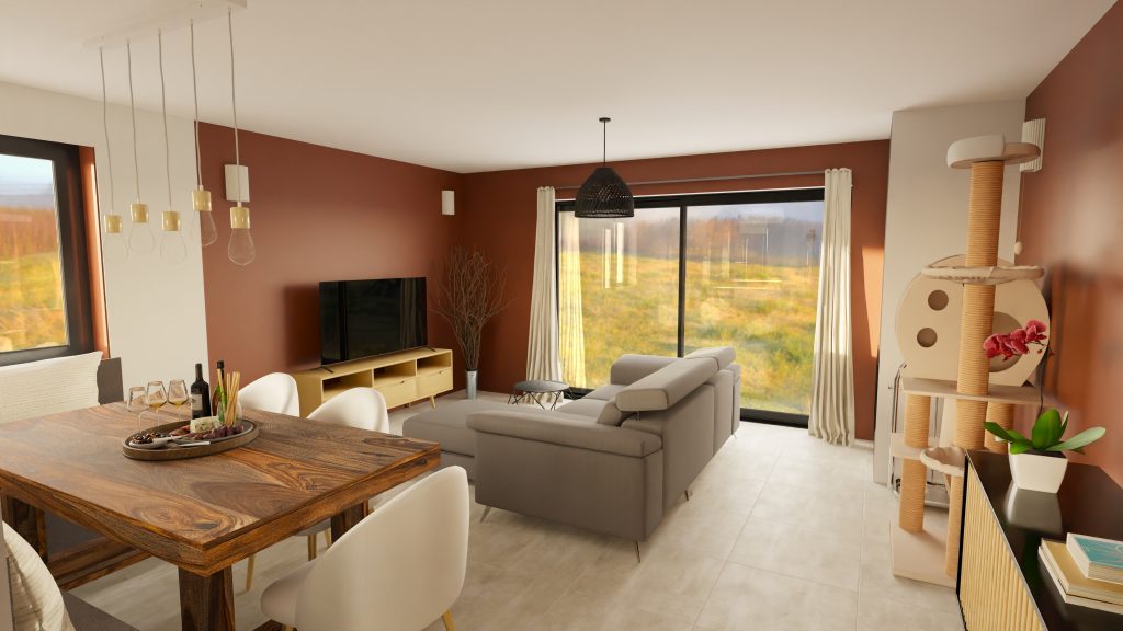 - Peinture type terracotta ou vert qui englobe le salon